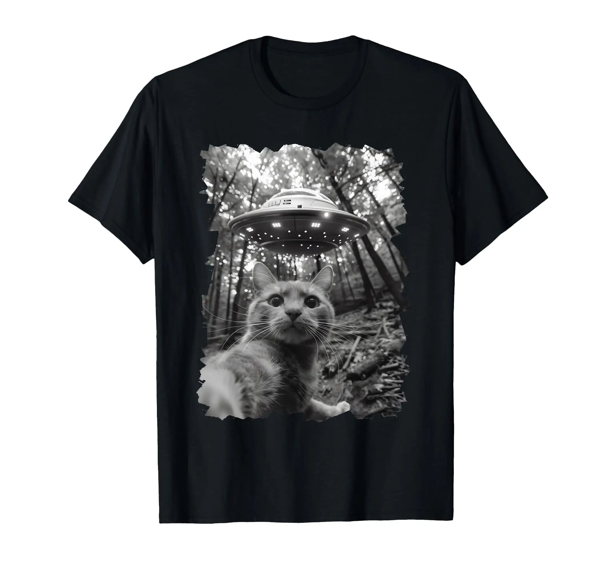 Funny Alien Cat Selfie UFO for Cats Lovers T-Shirt Men's Summer Oversized High Quality T Shirt Streetwear Harajuku Men Clothing
